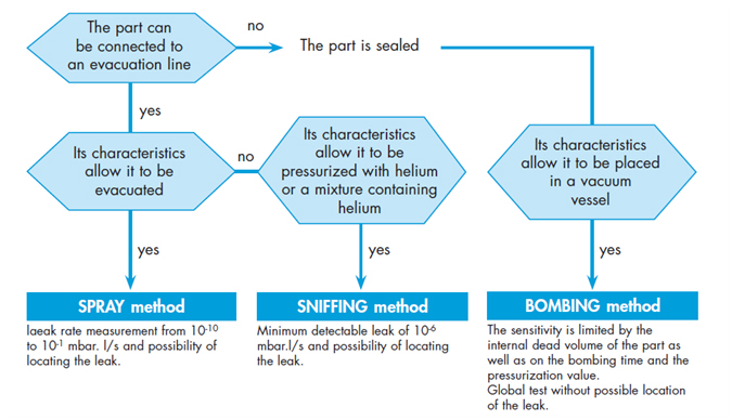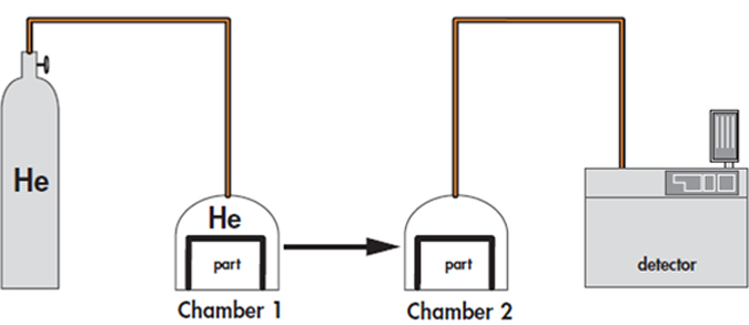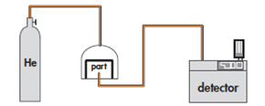The part is placed in a chamber containing pressurized helium. The helium penetrates the part if it has a leak. The part is then removed from the chamber and placed in another vacuum chamber which is connected to the detector. The helium escapes from the part through the leak and produces a signal. This signal is not a direct measurement of the leak as the helium pressure inside the part is difficult to determine. Several parts play an important part such as: the pressurization time, the helium bombing pressure, the internal volume, the aeration time, the size of the leak.