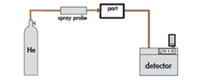 Potential leaking areas are sprayed with helium. The leak can be located. When spraying starts, the leak signal is not displayed instantaneously on the analyzer: there is a response time which depends on the volume V being tested and the helium pumping speed S of the system at the opening of the part, according to the following relation: T = V/S (T in seconds, V in litres, S in l/s) T is the time required for the signal to reach 63 % of the final value.